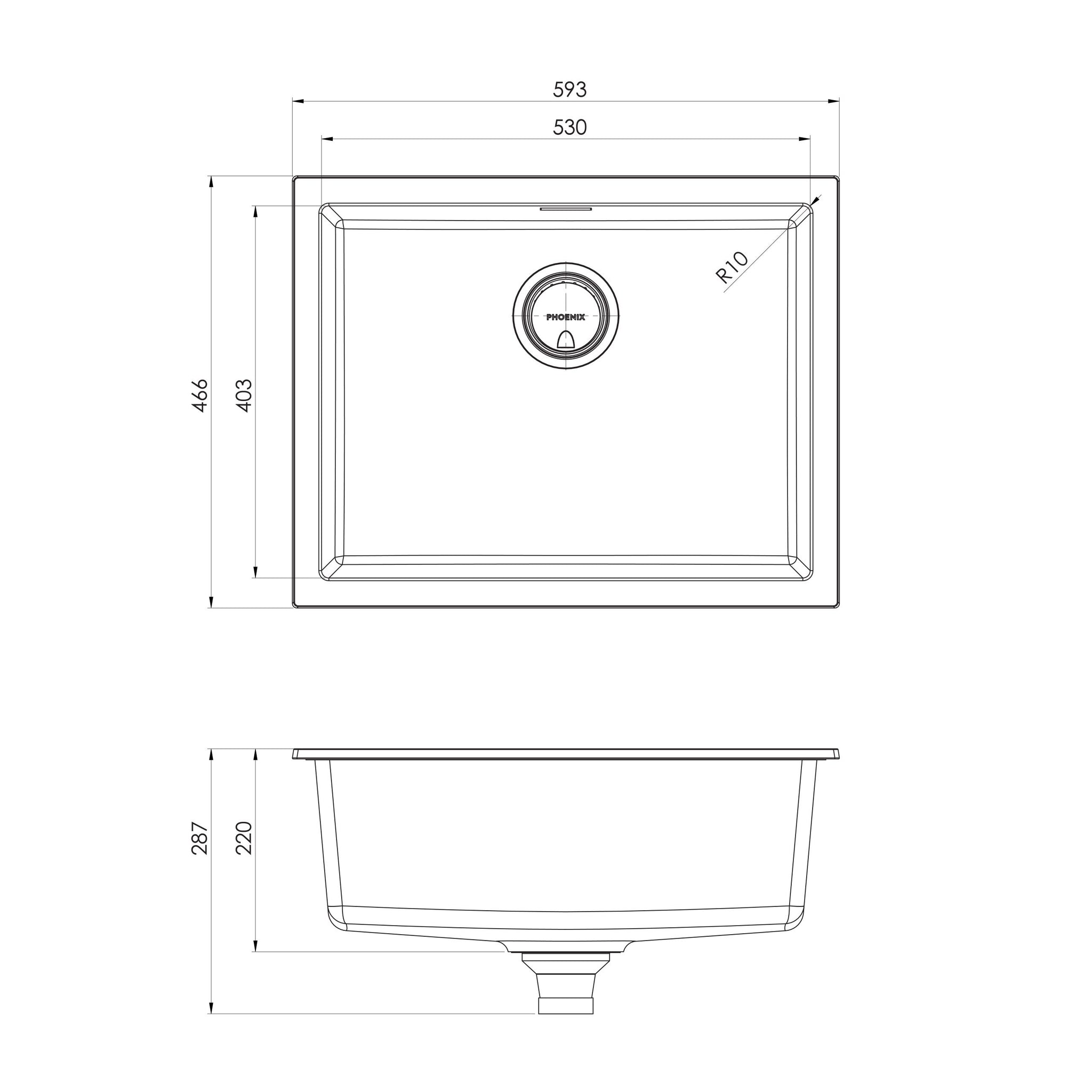 - 593 W x 466mm L (220mm depth)