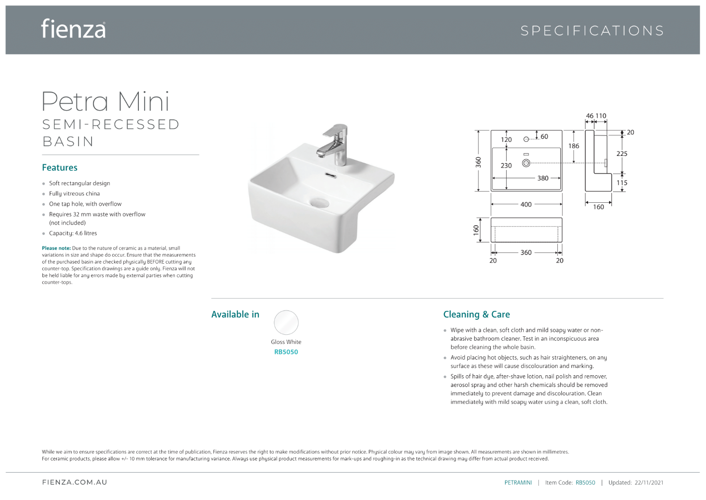 The Petra Semi Recessed Basin has been designed with a slimline edge to create bowl additional space, it has an integrated overflow to minimize flooding, with its modern soft rectangle design it is suitable for a narrow depth bench from 300mm deep, ideal for the smaller Bathroom, Powder Room or Ensuites.