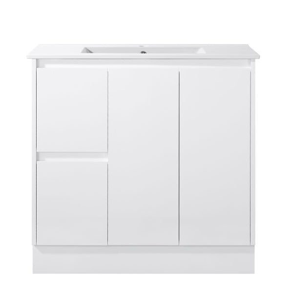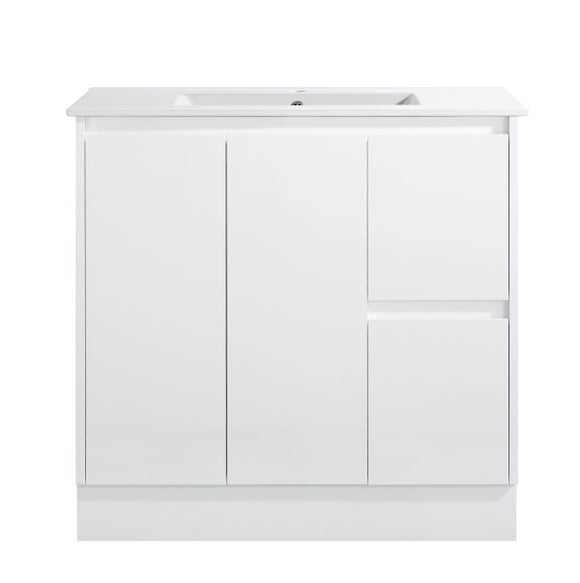 SK32-900W Sierra Narrow Ensuite Powder Room Floor Standing Finger Pull White Gloss Vanity Ceramic Top
