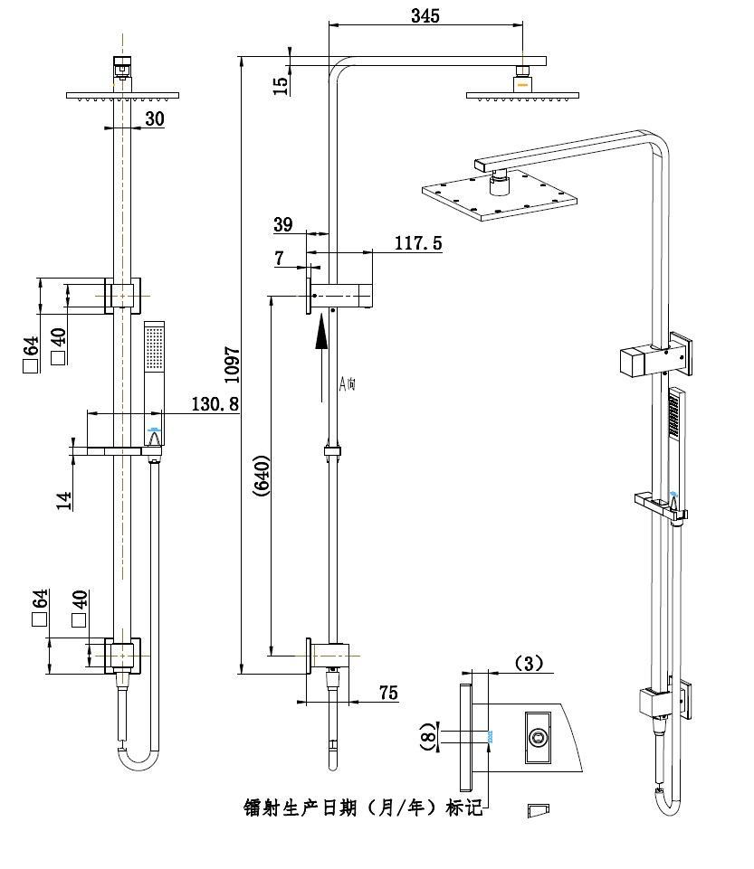 CHB-259 Anders Square Twin Rail Shower System Matte Black